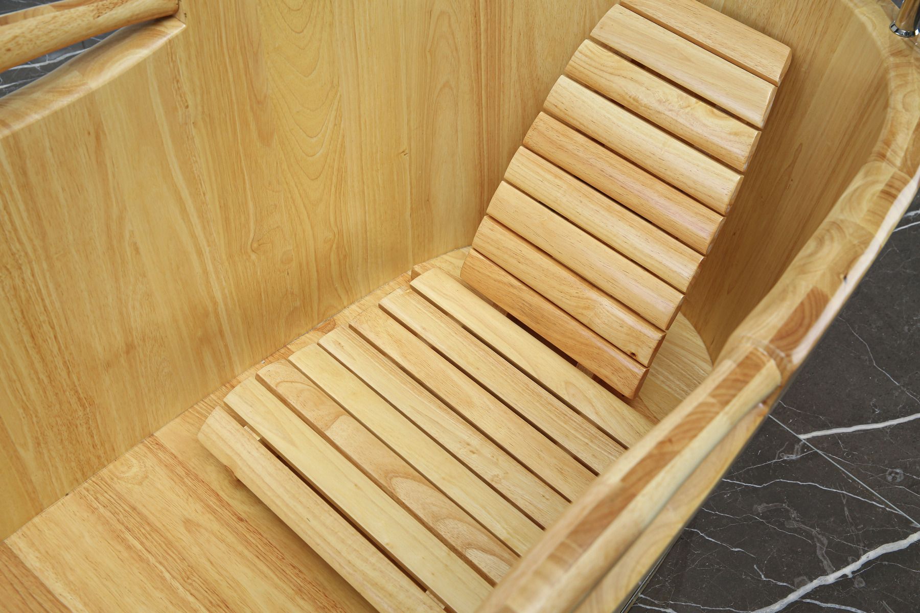 Feature 8 | Comes with a custom made removable wooden seat and back rest that fit inside the tub for increased comfort while bathing. |