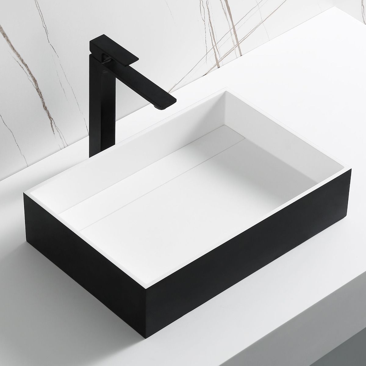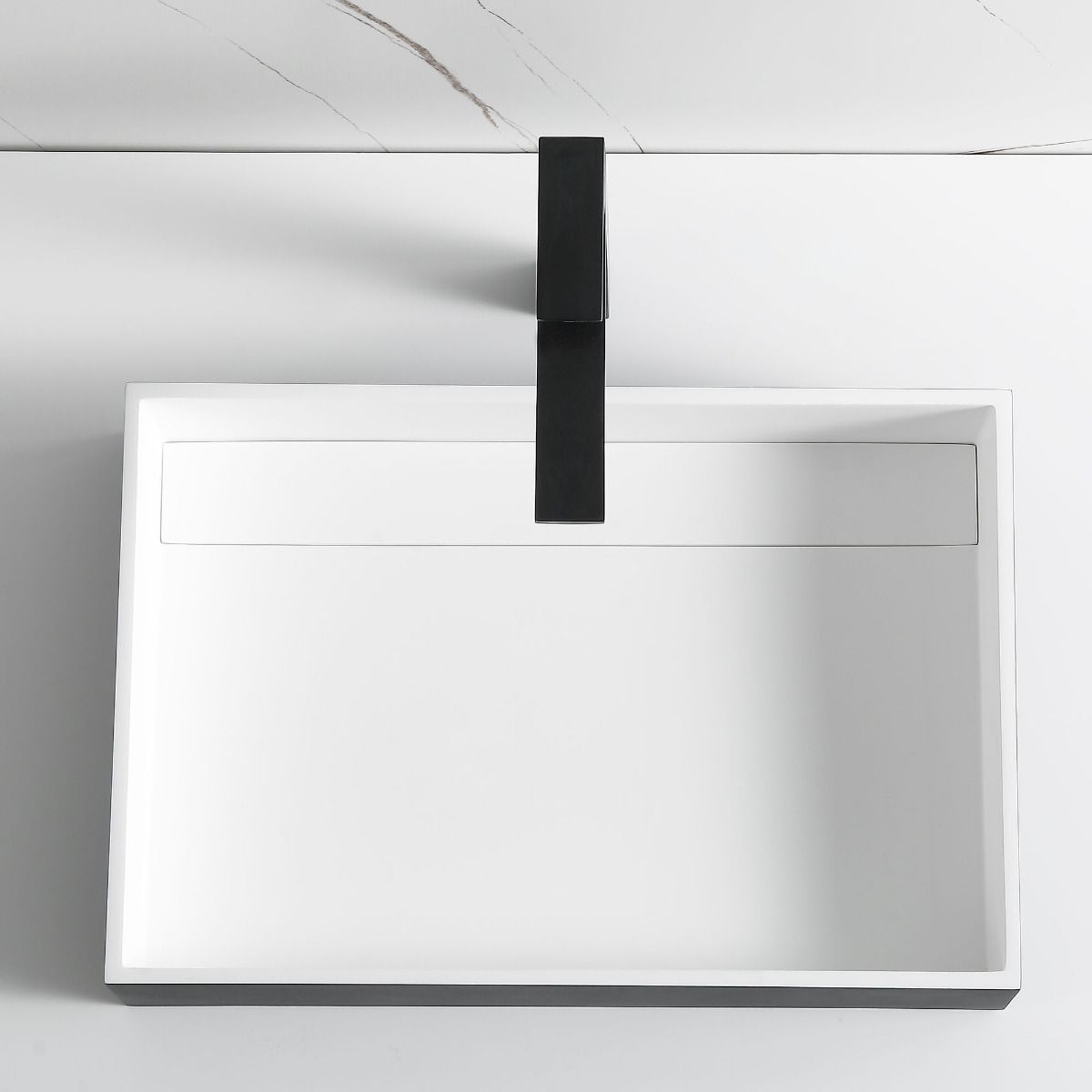 Short Description | This eye popping black matte sink is sure to make a statement! Upgrade your bathroom with this sleek modern rectangle sink made of solid surface composite. It's coolest feature is that the drain is completely concealed. It's designed with a contemoprary flair in mind featuring it's sharp corner radius and edges. |
