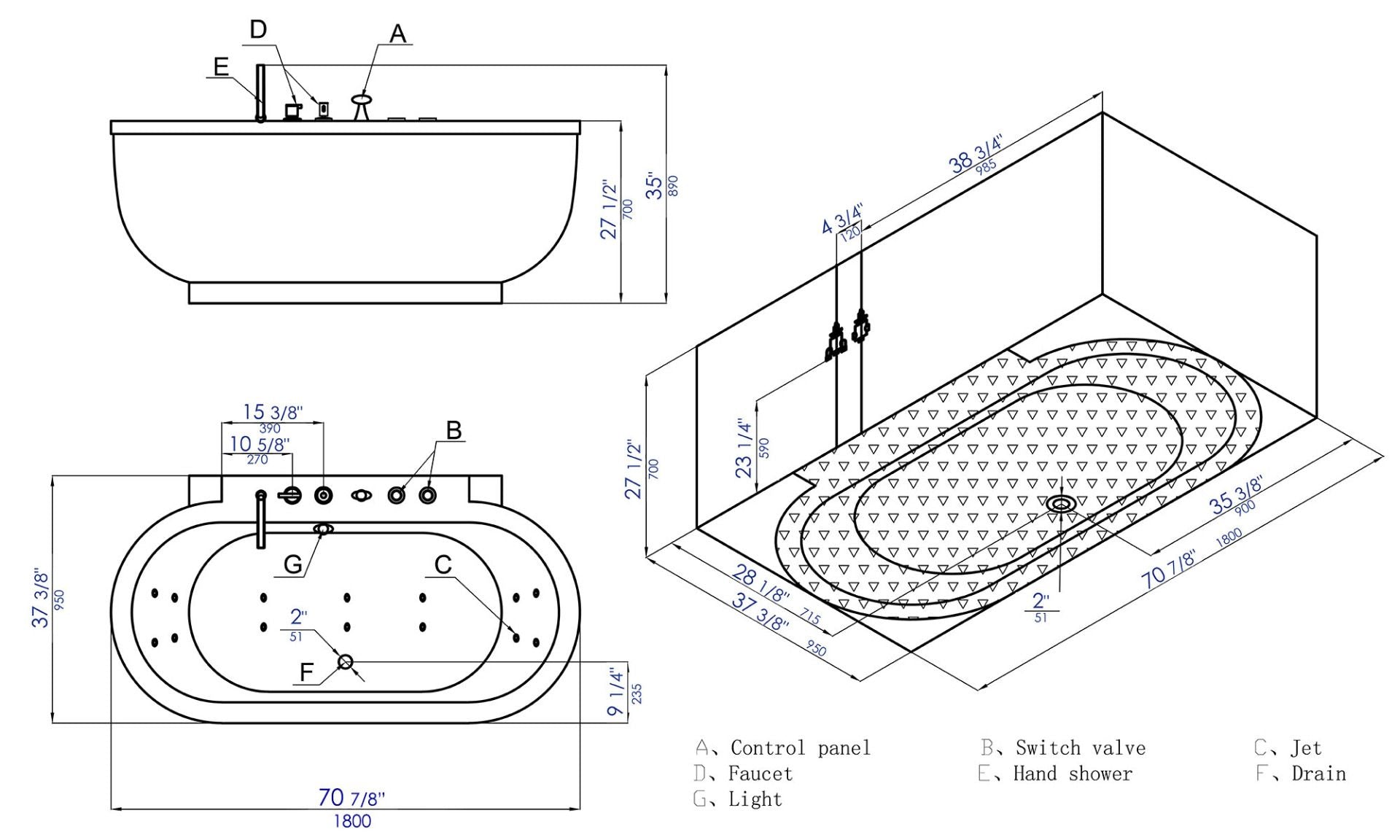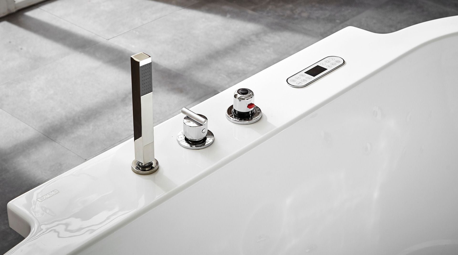 Feature 4 | Keypad Control Panel: Stylish control panel easily operates the bathtubs whirlpool jets, inline heater, digital sound system, and chromatherapy lighting. |