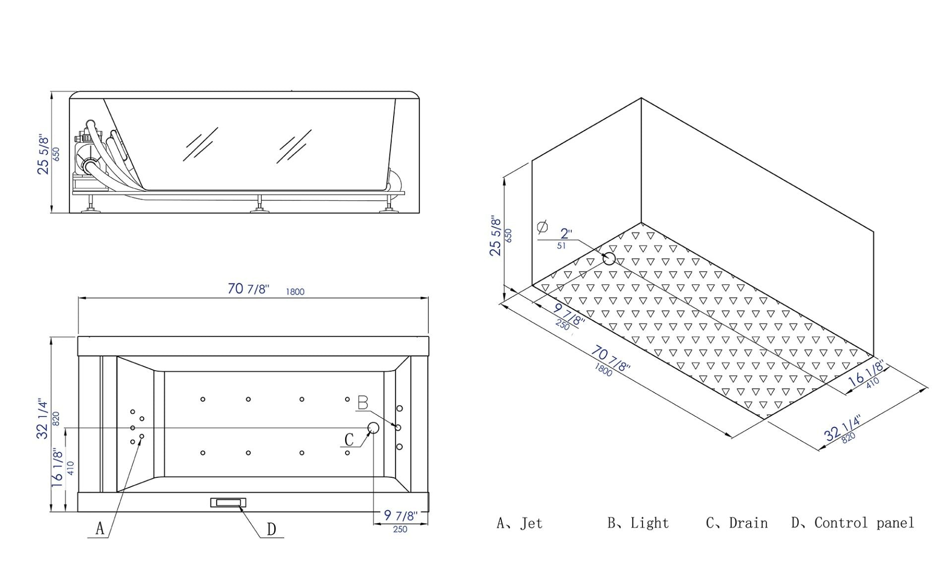 Feature 1 | The drain is located under the user's feet. The tub is 6 feet long. There is a smaller 5 foot model also avaiable (Model # AM152ETL-5) |