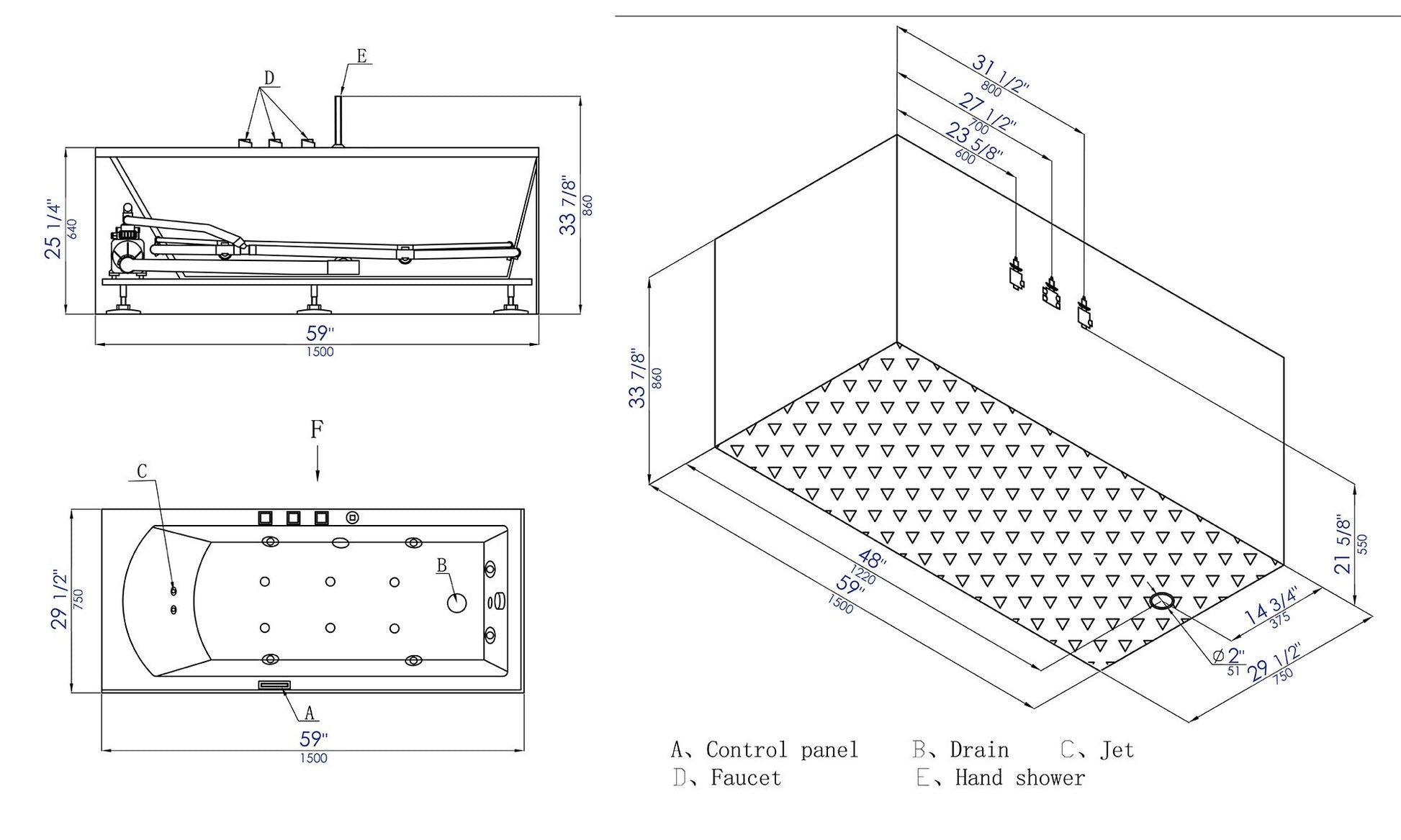 Feature 1 | The drain is located under the user's feet. The tub is 5 feet long. There is a larger 6 foot size also avaiable (Model # AM154ETL-R6). This tub is also available in a variant that enables the user to face the opposite direction (Model # AM154ETL-L5 and AM154ETL-L6). |