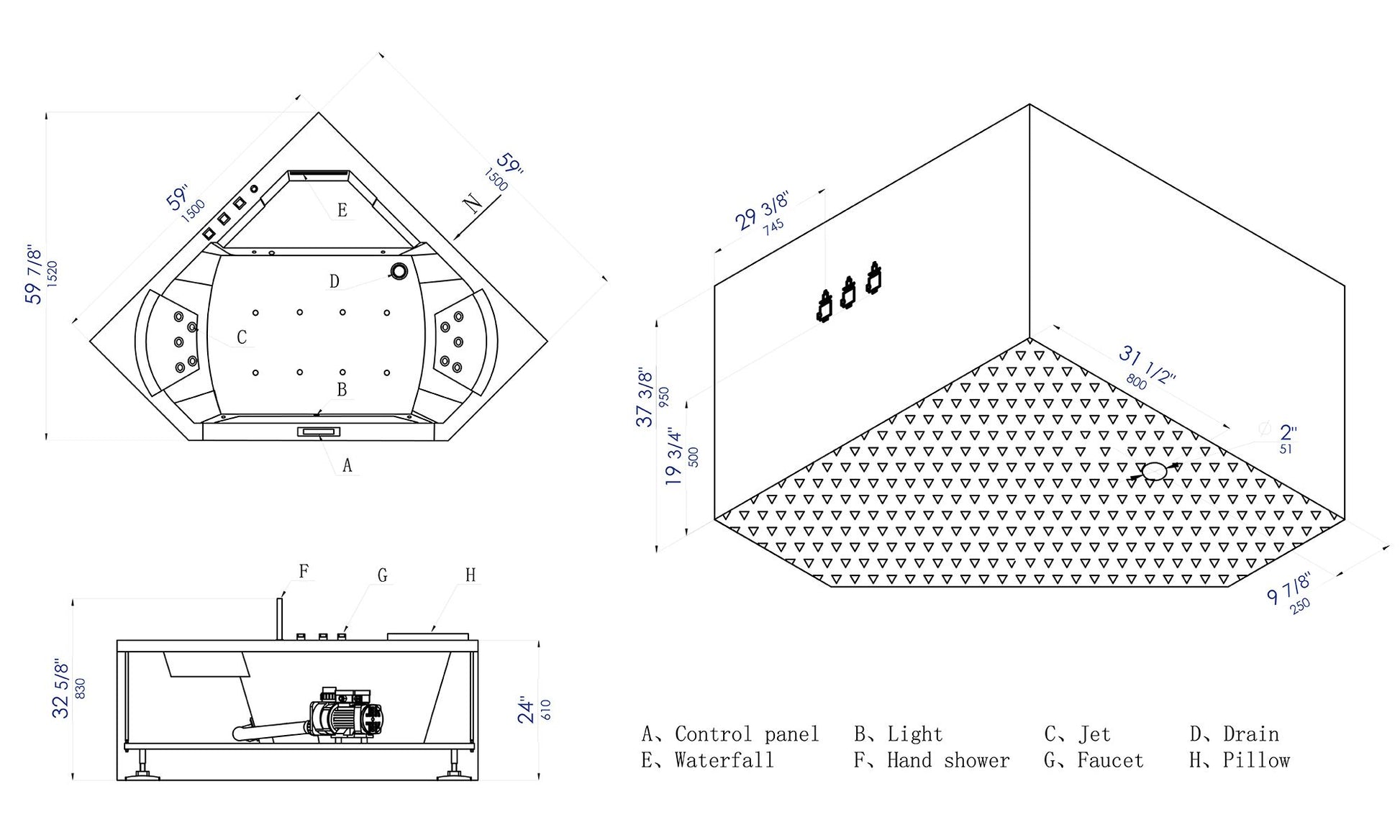 Feature 8 | Auto protection function for pump (if there is not enough water in the whirlpool bathtub the pump cannot be started) and 60 minutes auto shutdown function. |