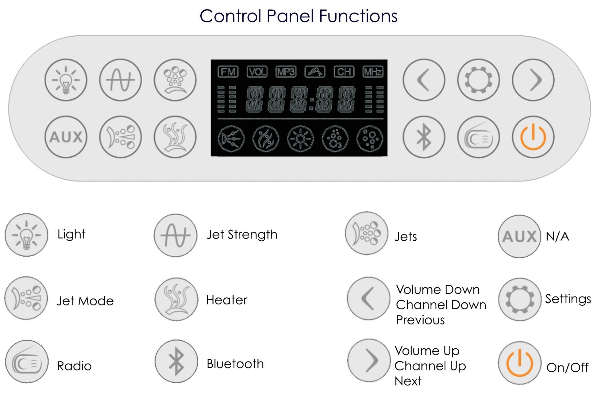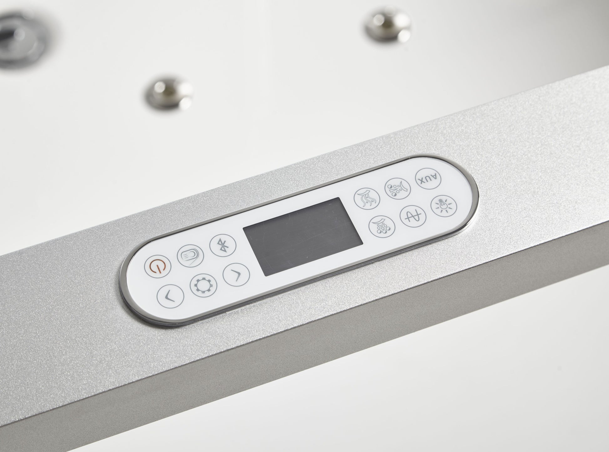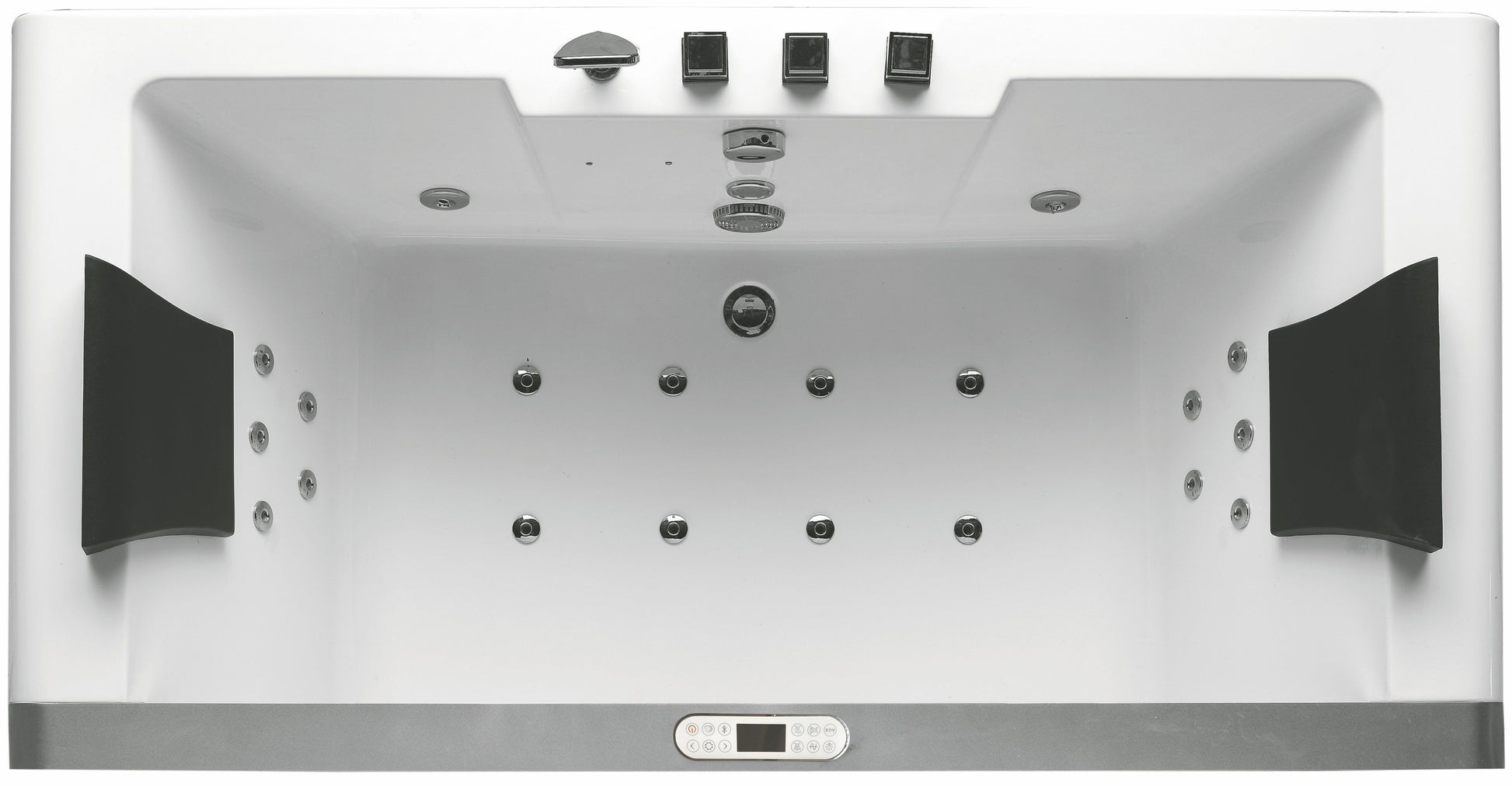 Feature 8 | Keypad Control Panel: Stylish control panel easily operates the bathtubs whirlpool jets, inline heater, digital sound system, and chromo therapy lighting. |